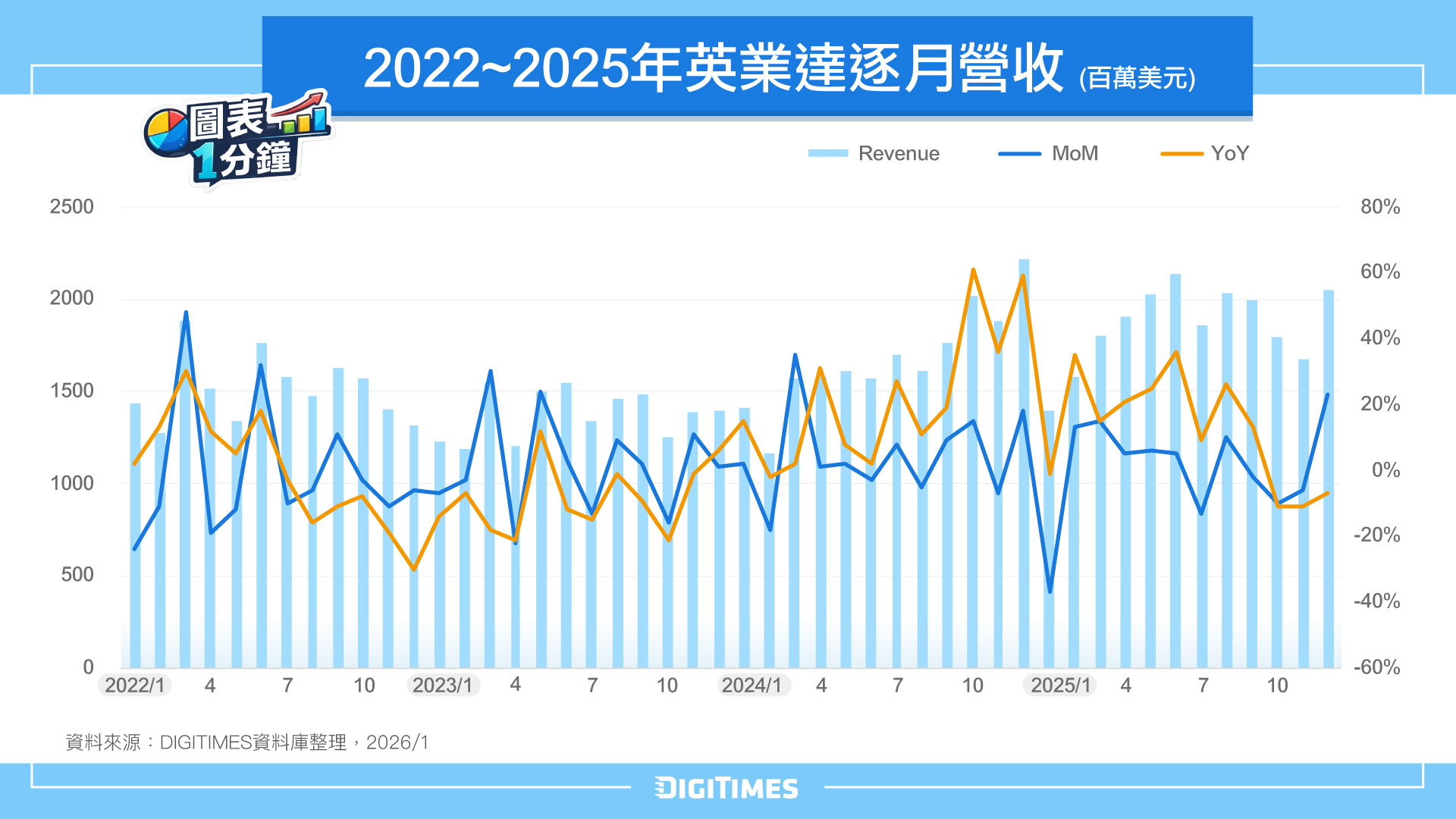 圖表1分鐘:2022~2025年英業達逐月營收走勢