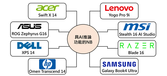 品牌業者宏碁、華碩、Dell、HP等,同時於2024年第1季展出具AI推論功能的NB,為提升AI推論的運算力,NB皆配備NVIDIA GeForce RTX 40 Series Laptop GPU及RTX 40 Series GPU。