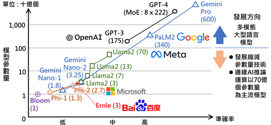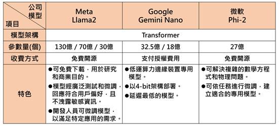 為符合邊緣裝置較低運算力限制,各業者積極發展縮減參數量技術,主流的小型語言模型(Small Language Model;SLM)包含Meta的Llama2 13B與7B、Google的Gemini Nano 1 (1.8B)與Nano 2 (3.25B)、微軟(Microsoft)的Phi-2 (2.7B)等,目前邊緣SLM推論運算以70億個參數量為主流語言模型。