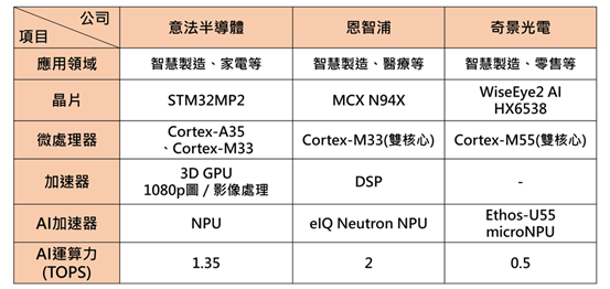邊緣AI推論晶片為運算力重要關鍵之一,為提升晶片AI運算力,目前以整合神經網路處理單元(Neural Network Processing Unit;NPU)加速器為主流,PC、NB晶片包括英特爾(Intel)的Core Ultra系列、超微(AMD)的Ryzen 8040 Hawk Point系列與Ryzen 8000G系列等,手機、平板晶片包括高通(Qualcomm)的Snapdragon 8 Gen 3、聯發科的Dimensity 9300等,物聯網裝置晶片包括意法半導體(STMicroelectronics)的STM32MP2、恩智浦(NXP)的MCX N94X、奇景光電的WiseEye 2等。