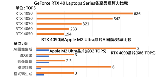 NVIDIA GeForce RTX 40 系列加速器運算力為194~686 TOPS,藉由GPU的高運算力加速AI圖像生成、3D渲染、圖/影像編輯的工作效率,其中,以加速AI圖像生成提升運算效率最高,為使用Apple M2 Ultra晶片運算效率的8倍,可有效達成降低AI運算的時間與功耗。