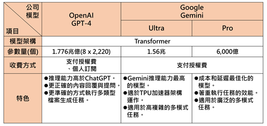 多模態大型語言模型指標業者目前以OpenAI與Google為主,OpenAI於2023年10月推出GPT-4多模態版本,模型架構以8個預訓練專業模型整合而成,每個模型具有2,220億個參數量,整體模型總合為1.776兆個參數量,GPT-4與ChatGPT (GPT-3.5)差異除文字對話外,還能輸入圖像由AI解讀,且回覆能力和正確率超越ChatGPT,另外,GPT-4的API輸入Token上限,提高至32K,達32,768個Token,為ChatGPT (4K)的8倍。
