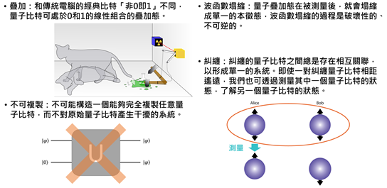 「量子疊加」、「波函數塌縮」、「量子糾纏」是量子力學的基本特性,而「不可複製定理」則是確保了量子加密通訊的安全性,可以避免金鑰被竊聽和被破解。