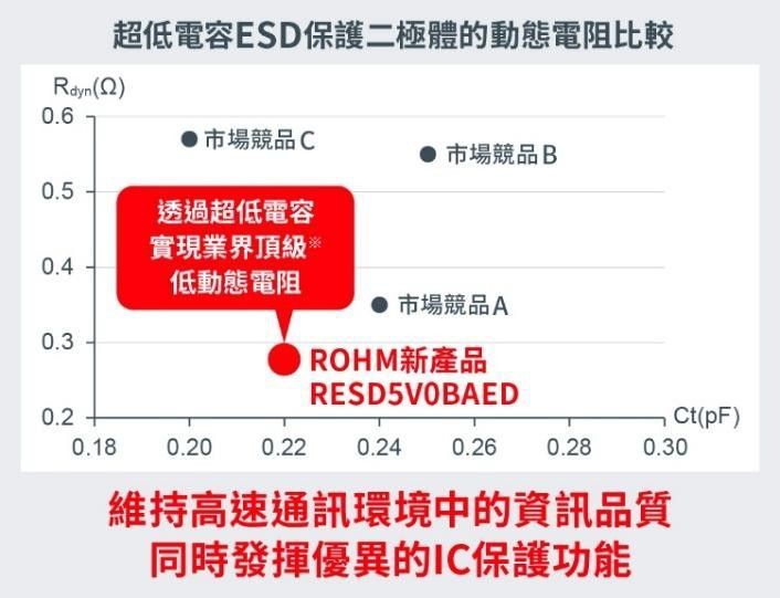 對此ROHM推出了能夠解決此課題、並支援更高速通訊的RESDxVx系列產品。新產品不僅實現更低電容,更實現更低的動態電阻。超過10Gbps的高速通訊介面,需要可將訊號劣化控制在更低、且具備出色IC保護性能的ESD保護二極體。