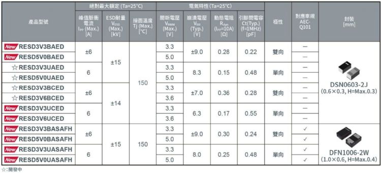 上述優勢有助提高各種高速資料通訊設備(例如AI伺服器和5G/6G通訊設備等工業設備,NB和遊戲機等消費性電子產品)的可靠性。另外DFN1006-2W封裝的「RESDxVxBASAFH」和「RESDxVxUASAFH」符合汽車電子產品可靠性標準AEC-Q101的規範,亦適用於導入SerDes通訊的ADAS(先進駕駛輔助系統)、AD(自動駕駛)攝影機以及ECU(電子控制單元)等應用。